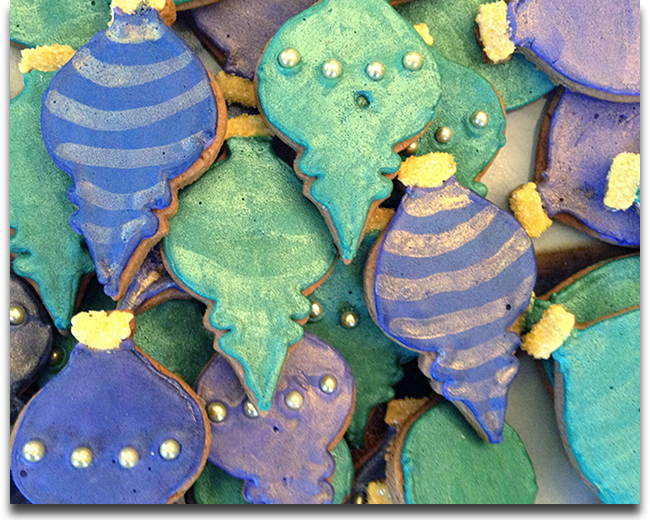 Crisp sugar cookie ornaments, elegantly decorated in gold and jewel tones for a holiday party